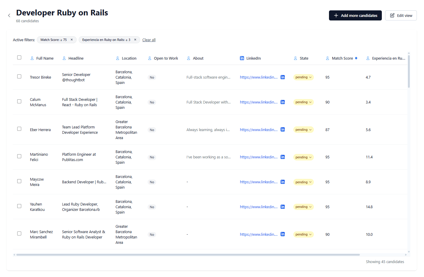 Ya tienes tu lista creada. Ahora puedes filtrar los candidatos por años de experiencia, herramientas, idiomas y mucho más. Puntuamos tus candidatos en base al encaje que tienen con la Job Description.